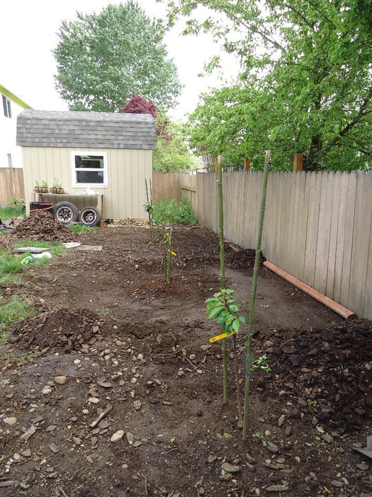 This is a partial shot of my backyard (another work in progress). The trees are newly planted bare root fruit trees from Wilco. The green stakes are bamboo harvested from my parents’ yard.