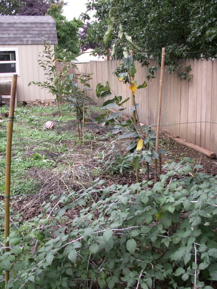 The dwarf cherry trees are getting bigger and I planted some black raspberries (also known as “Snap Caps”) in the foreground.