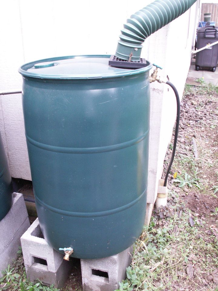 This is the finished rain barrel project. They have been up and running for several months and work like a dream. The water comes in from the drain spout and fills up both 55 gallon drums (there is another one daisy-chained to this one to the left). One they fill up completely the excess runs out the black hose on the right and down the storm drain.