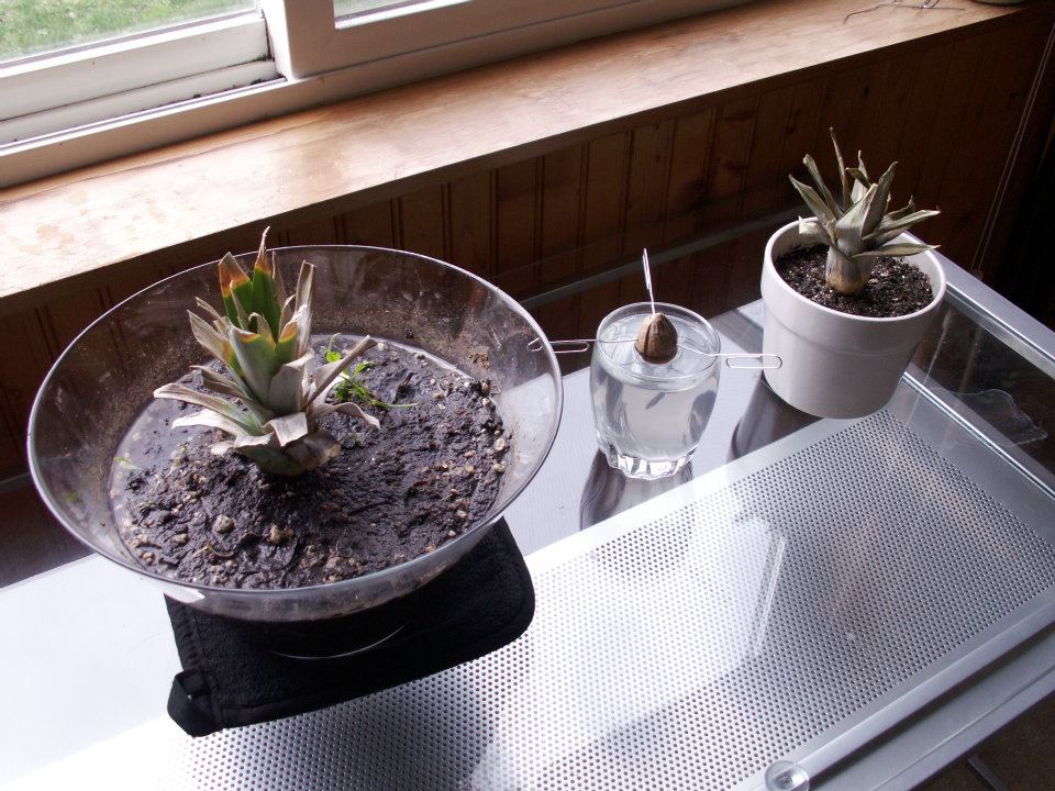 Update: The avocado sent up a sprout that lasted for a few months but unfortunately died off. The pineapples just slowly decayed until I threw them into the compost bin.