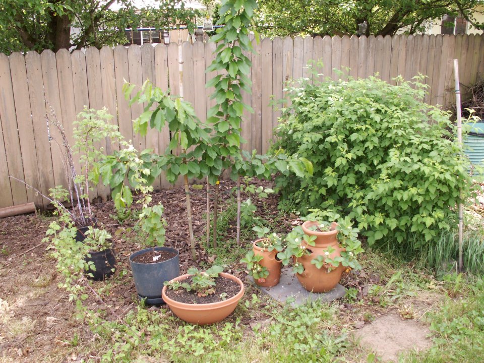 Last year’s work is still producing. The dwarf cherry tree had a growth spurt and the black raspberries really filled in. Also shown are strawberry plants and the newest addition, grapes. It should be a good harvest this year.