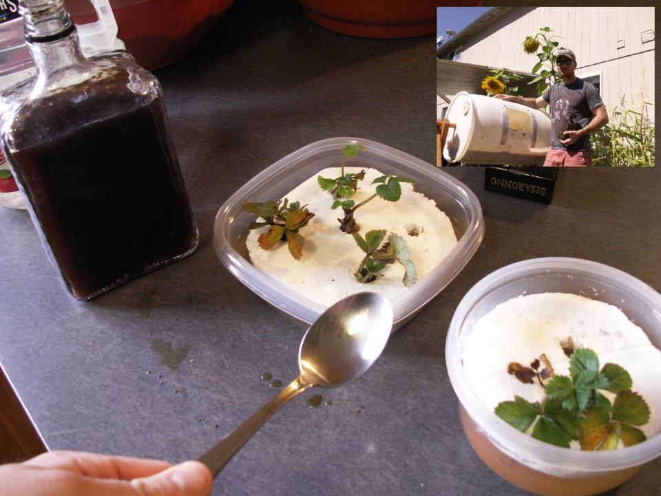 The strawberry plants are runners that would have died off this winter so I plugged them through some Styrofoam and floated them in rain water.