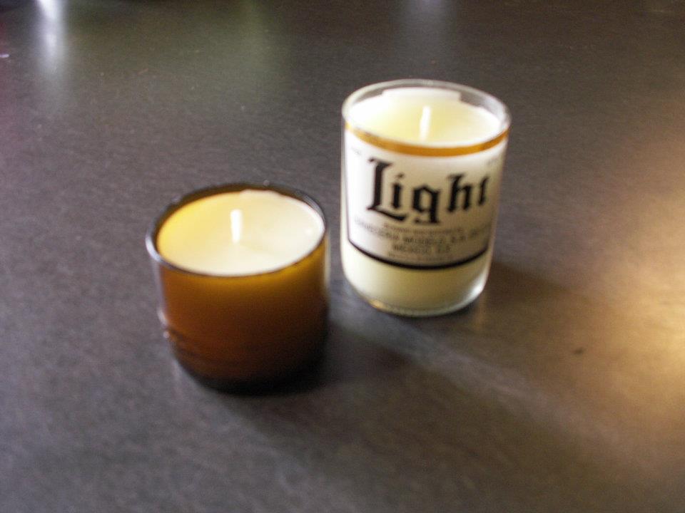 These are candles we made from scratch. They are made of honey bee wax that was poured into beer bottle halves.