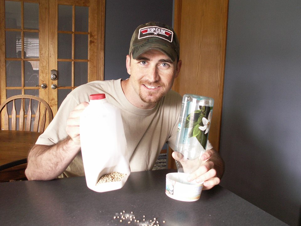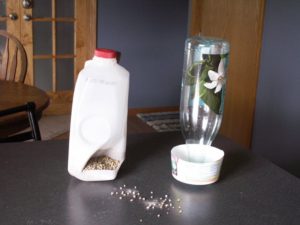 The waterer is a physics phenomenon. Drill a 3/4” hole in the bottom of a large yogurt cup. Then trim down the sides to the desired height. Screw a plastic bottle through the 3/4” hole that you drilled. You will then mark on the bottle the level where you want the water to rise to (I went about ¼” below the lip).