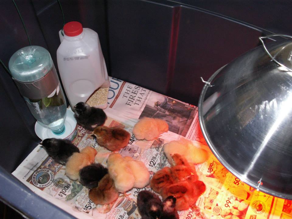 This is me hanging out with General Tso…Chickens have several functions, egg laying being a major one. There are three breeds of chicks here which are known to be hardy egg layers; Barred Rock, Rhode Island Red, and Buff Orpington.I had specific breeds that I wanted and couldn’t find them locally so I had them shipped through the USPS. I was chuckling to myself as I stood in line at the post office as I could hear my chicks peeping back behind the counter.The light in the corner puts off heat to keep the chicks warm. As they get older the heat lamp gets raised higher and higher until they no longer need it.
