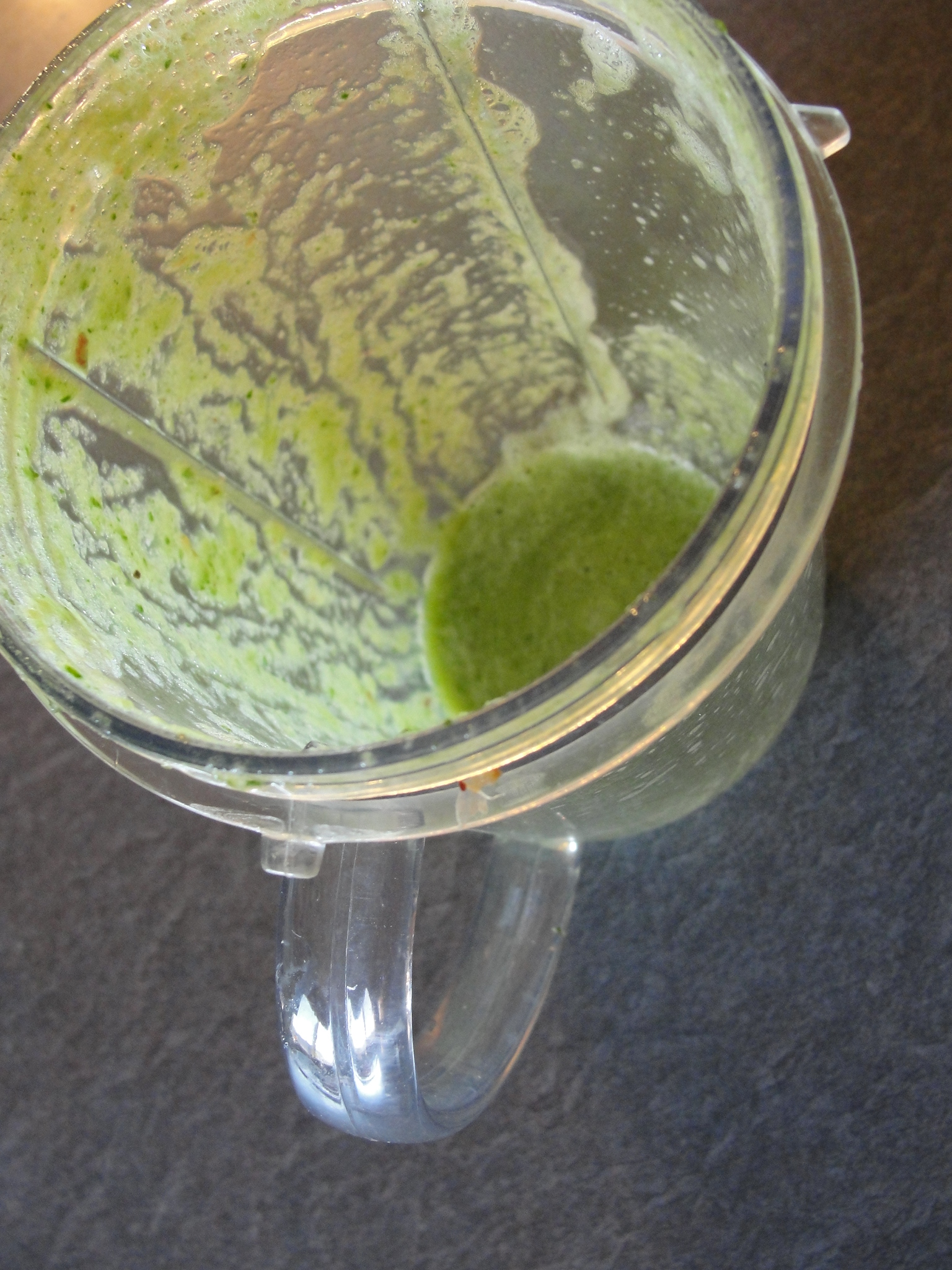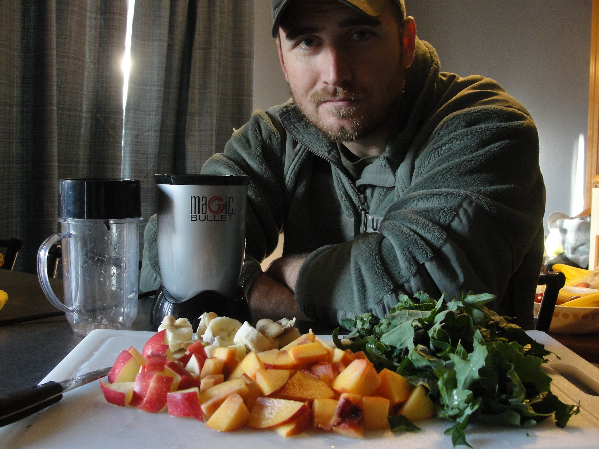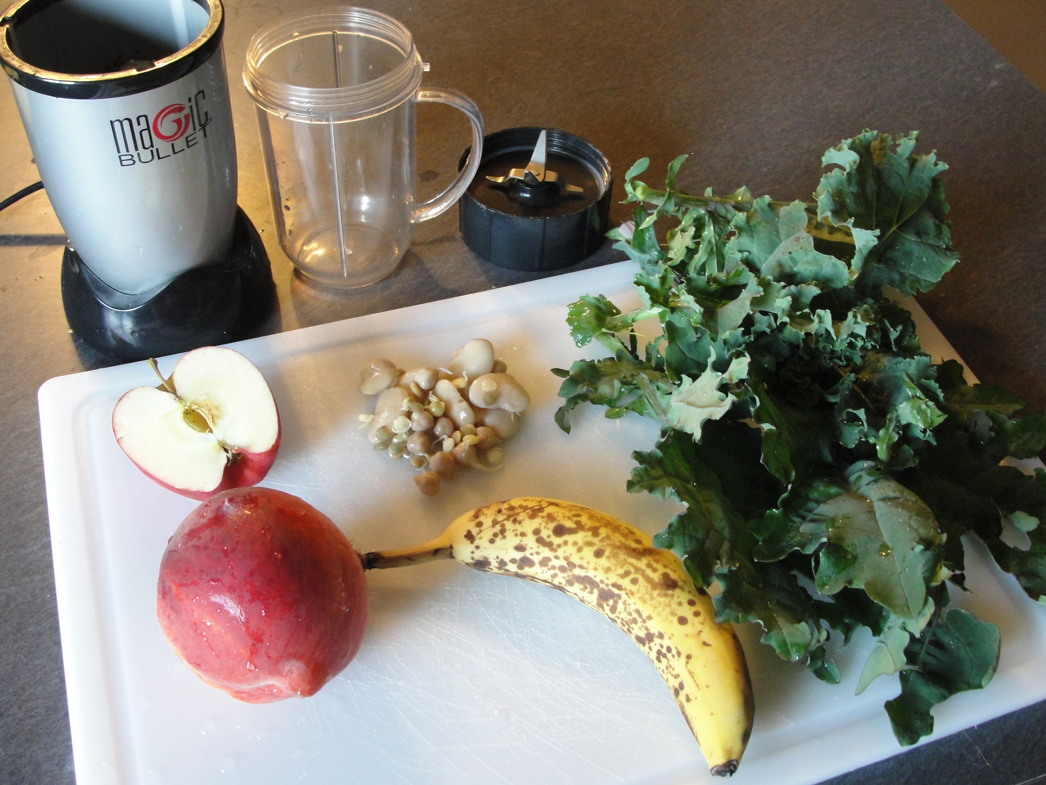Cut ingredients into small pieces, add water, blend, and choke it down. If it tastes awful, add more bananas and fruit to sweeten it up. If the smoothie is too thick for your liking add more water and re-blend.