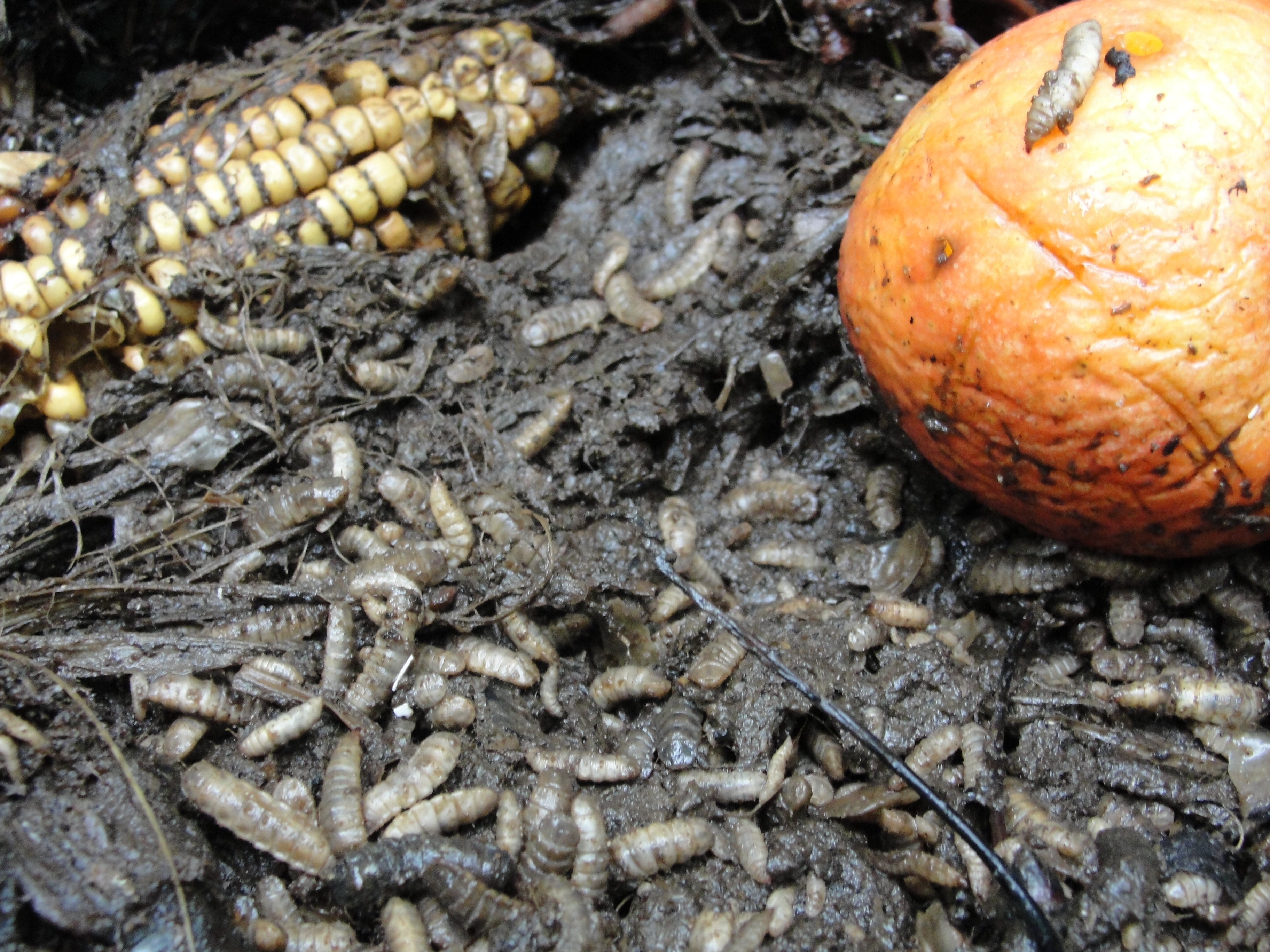 There are hundreds, perhaps thousands of black soldier fly larvae in my compost bin! They are the spawn from about 75 original larvae which I bought 4 months ago. Between the redworms and the larvae I should be able to supplement some of the feed for my chickens and tilapia.