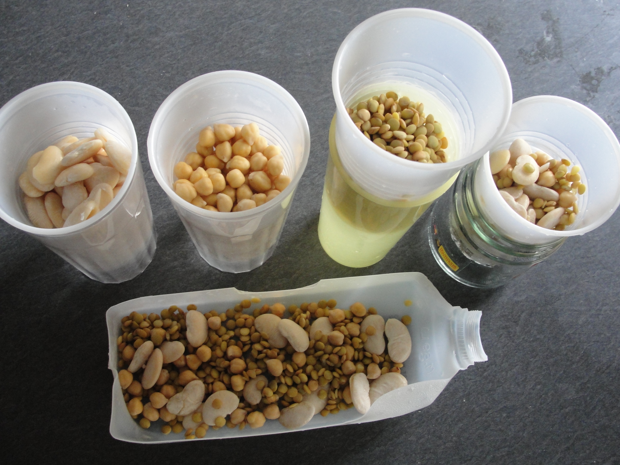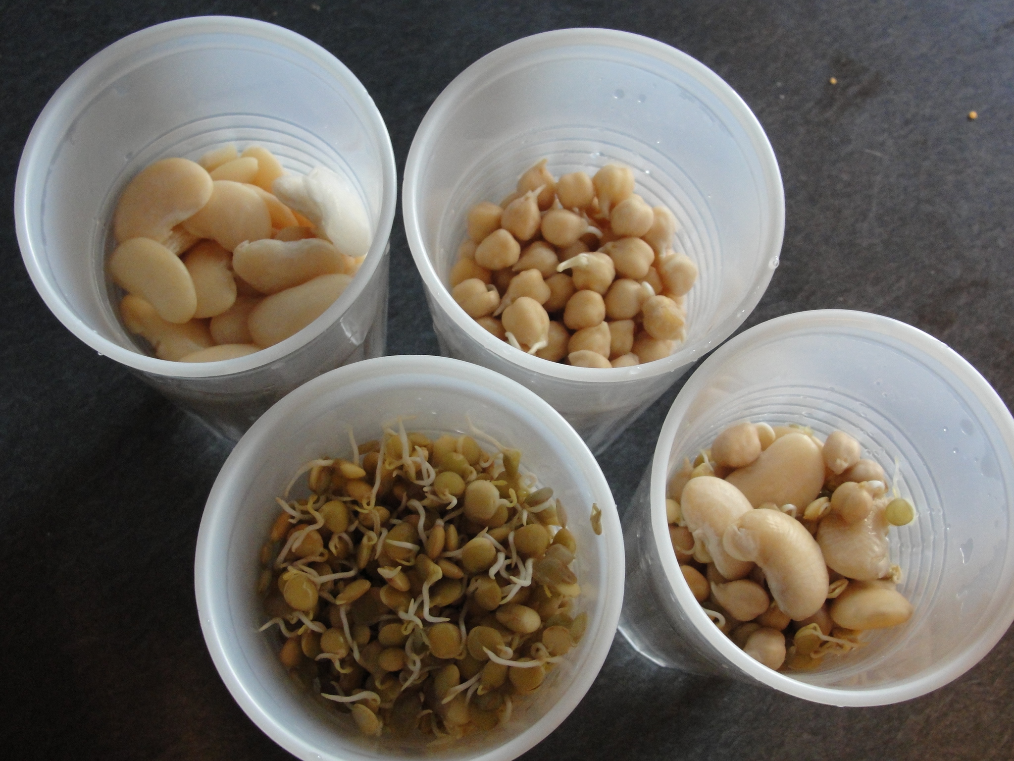 In this experiment I used lima beans, garbanzo beans, and lentils. I soaked them in water overnight. The following morning I put them in plastic cups with holes drilled in them so that air could circulate and the water could drain. Twice a day I rinse them with water and allow them to drain.