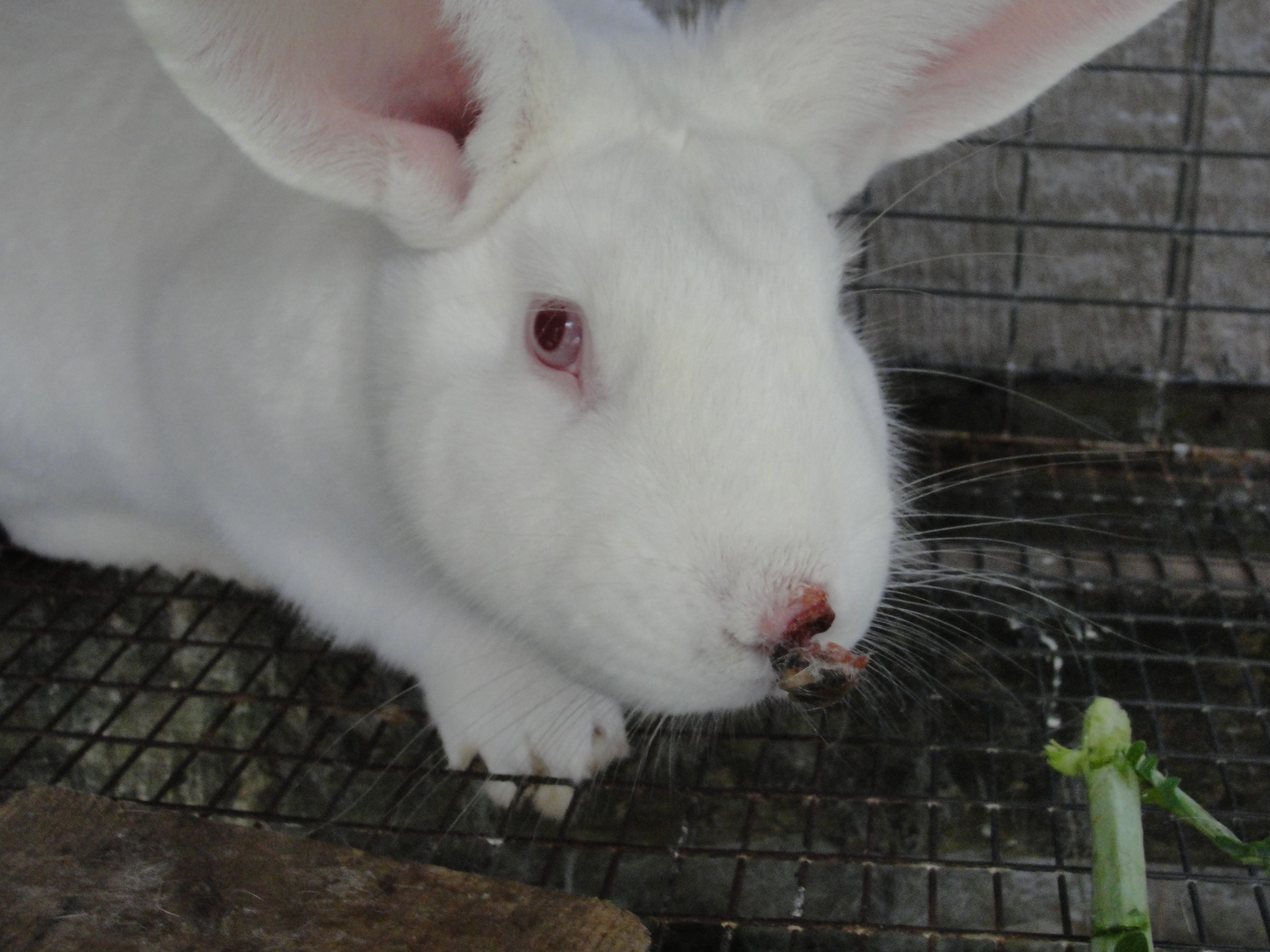 When I bred the rabbits it appeared that the male (Scofield) wasn’t “finishing” the job. The female would dominate him and he’d go running away. During their last encounter the doe scratched/bit Scofield’s nose which proceeded to get infected and swelled to an abnormal size. It looked like Rudolph the red nosed rabbit.
