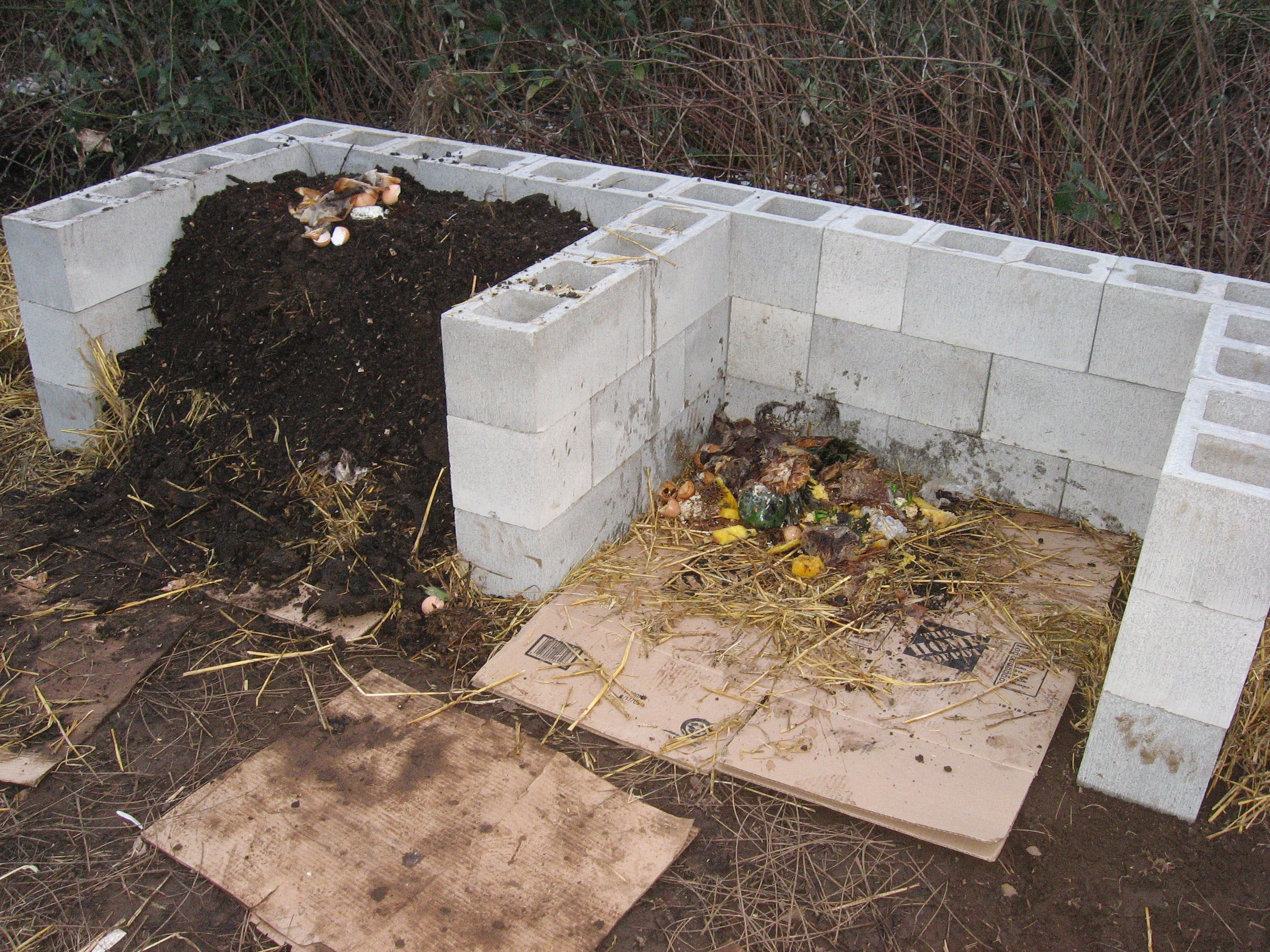 This design cost me approximately $45 in materials. I used 34 (8 X 8 X 16) cinder blocks, 7 (8 X 8 X 8) cinder block halves, and a 5’ X 7’ tarp. The layers of cardboard beneath the pile will act as a barrier to keep weeds from coming up underneath.