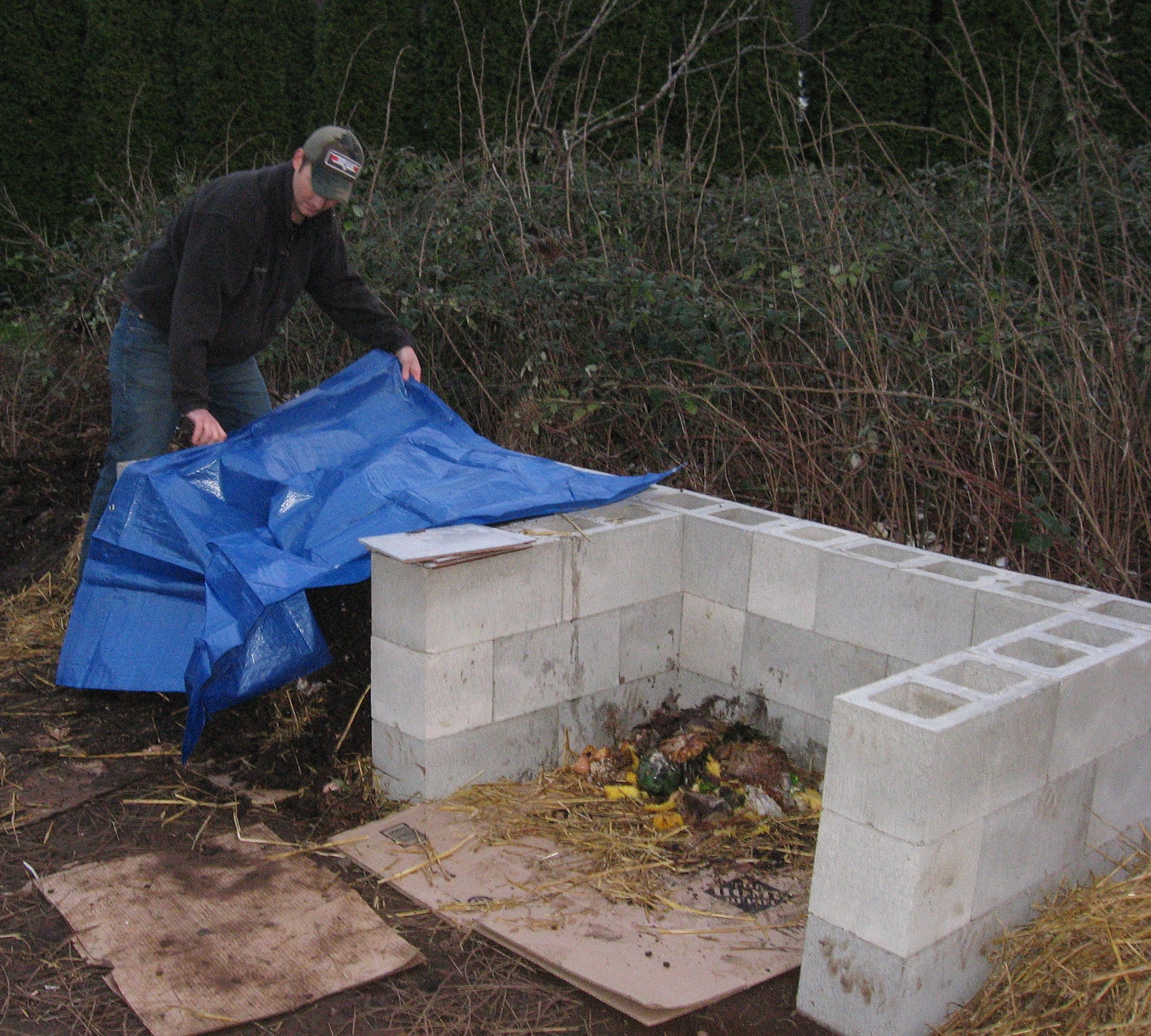 This design has 2 areas for compost however only one is used at a time. When you go to rotate the pile, you simply pitch fork it into the empty area. It’s that easy. The compost material that was on the top of the pile will now be on the bottom and ensures that all of the material is getting oxygen during the breakdown process. The tarp is to prevent the pile from getting too much water. Here in Washington this is essential as it rains quite frequently.