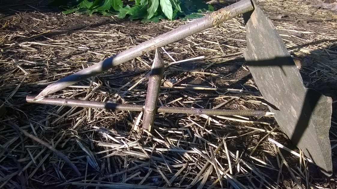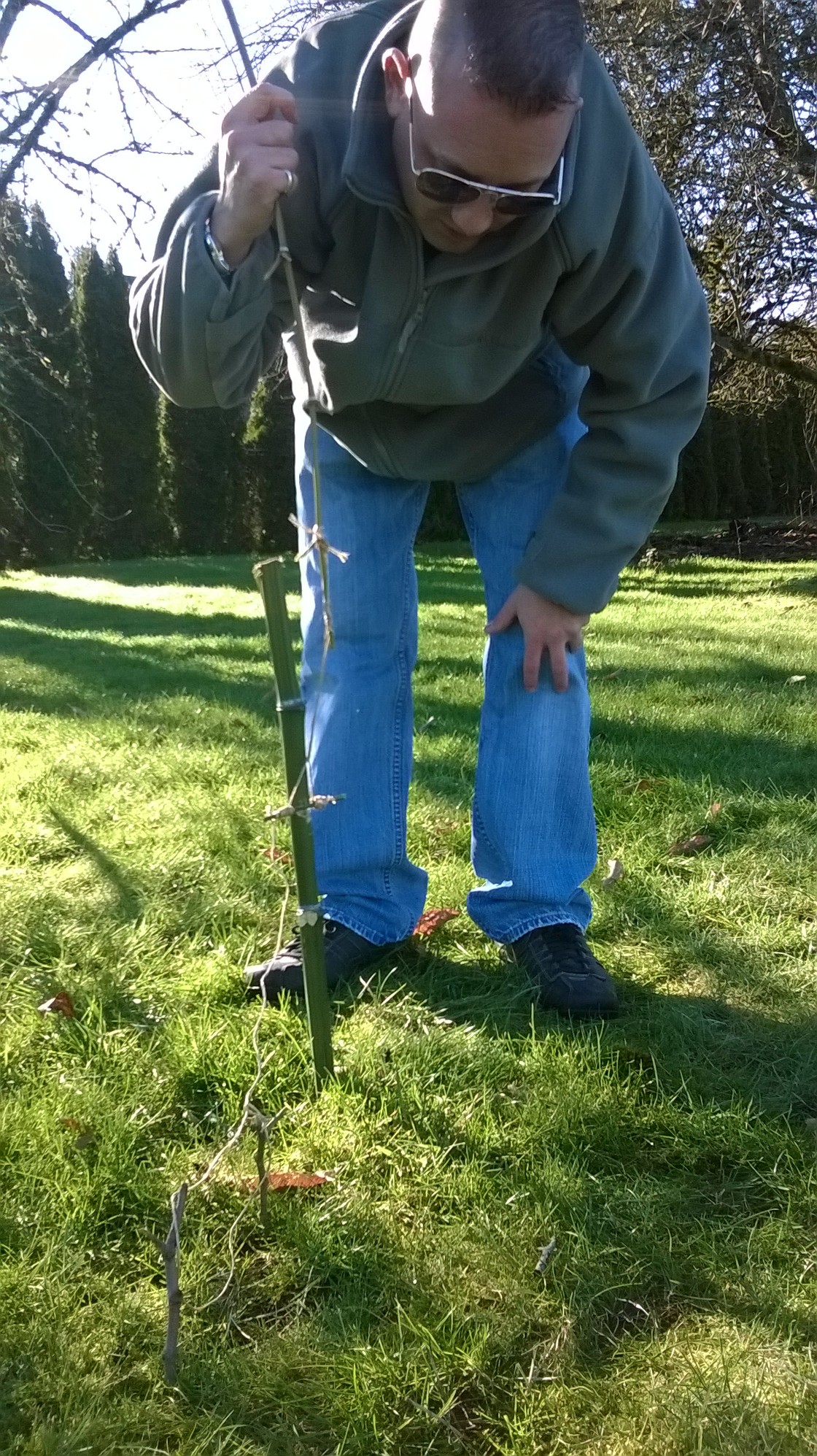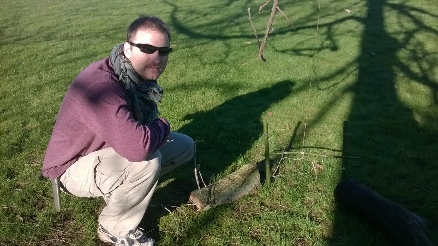 We also practiced a figure 4 deadfall trap. This one required some primitive machinist skills to notch the sticks correctly. The flat rock is balanced precariously on the sticks so that if the bait stick is disturbed, the rock will crush whatever critter is underneath it. We used peanut butter to cover the tip of the bait stick.