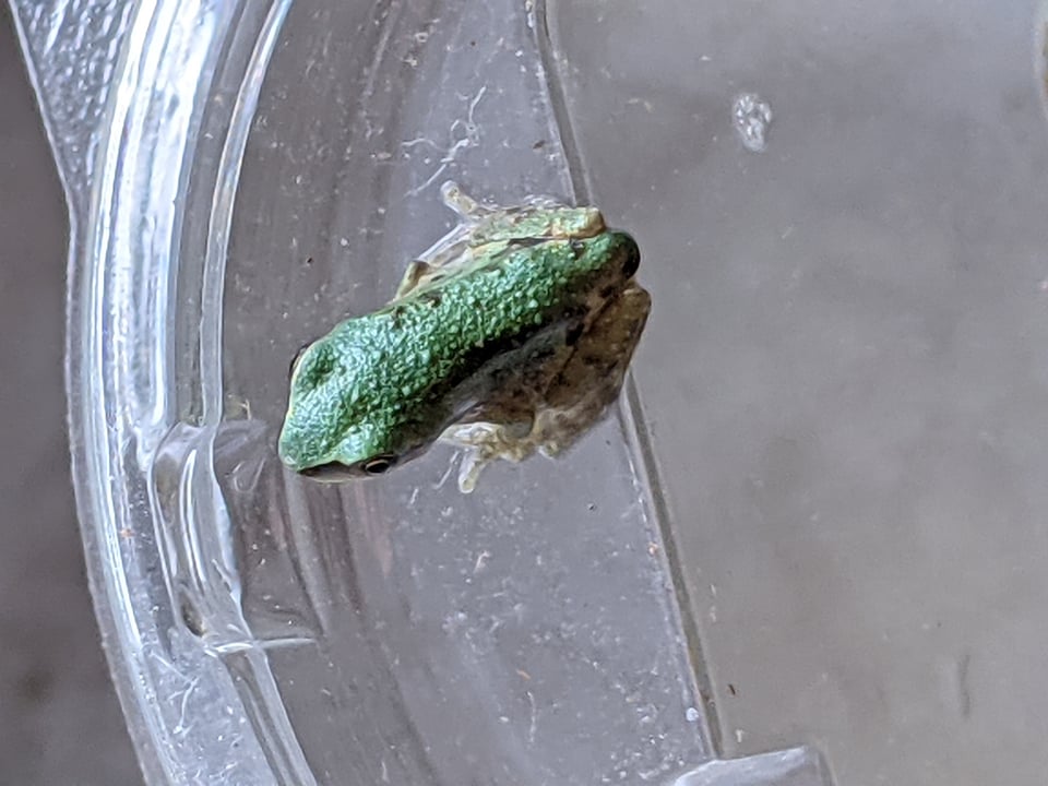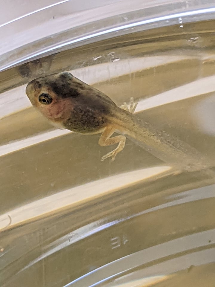 Once the front legs appear they thin out into a frog shape but still have tails. Day by day their tails get smaller and they have a harder time swimming to the surface for air. This was part of the reason for me putting them in a bigger but shallower container. The rocks and sand in the bottom gave them an easier way to get to the surface.
